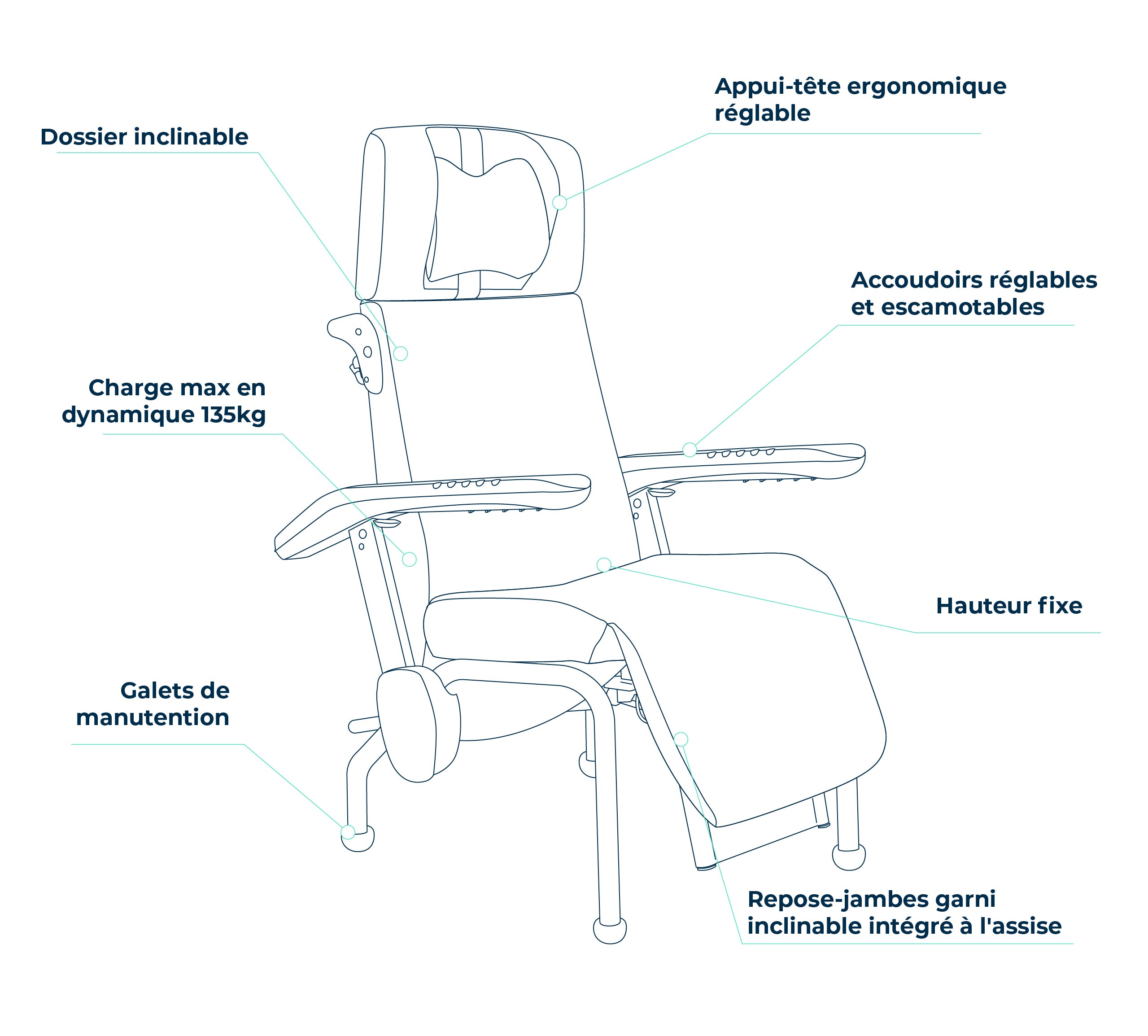 Dossier anatomique avec soutien lombaire, appuie-tête réglable, assise inclinée à -10° et accoudoirs étudiés pour les positions semi-allongées : chaque détail a été pensé pour maximiser le confort en position de repos prolongée et faciliter les soins.