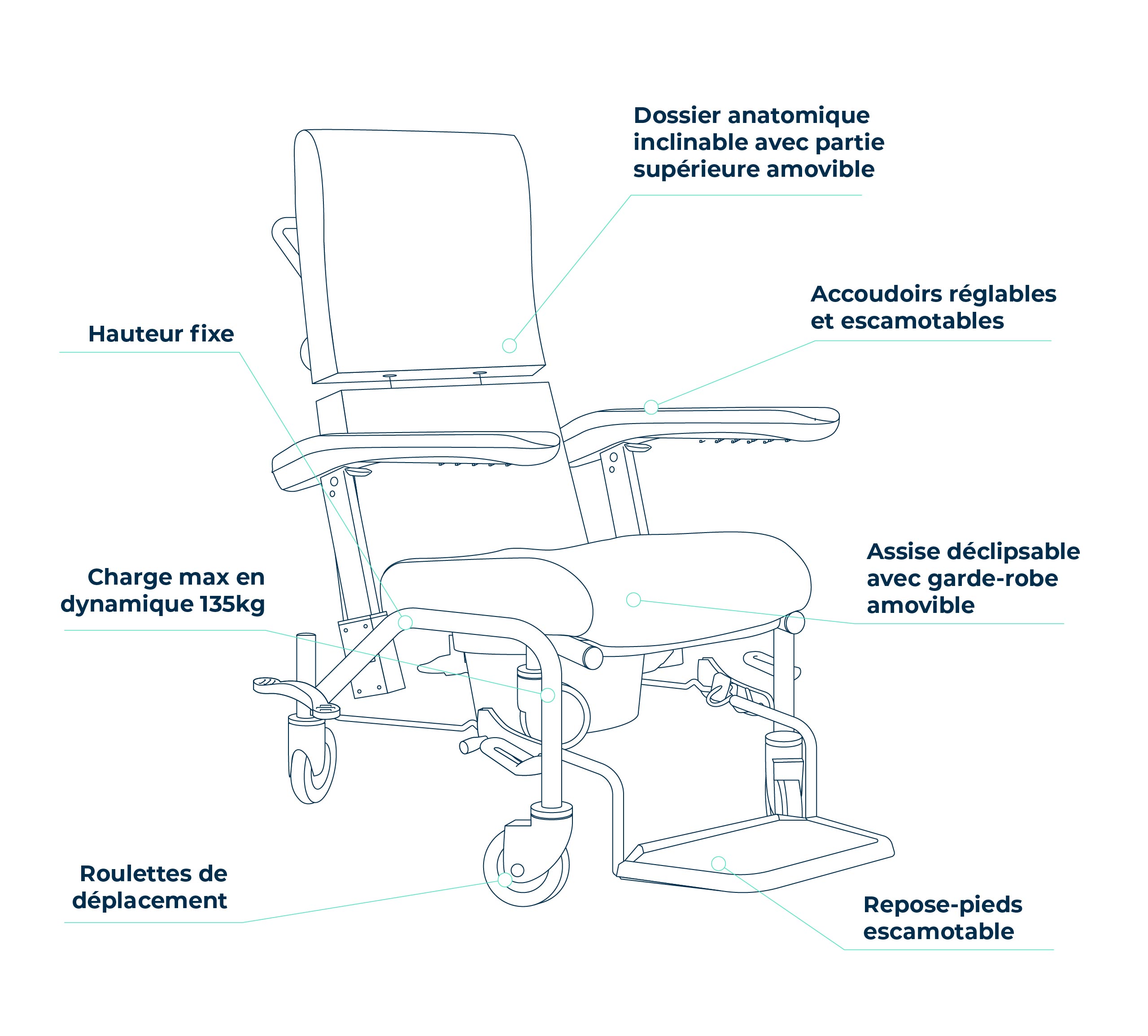 Le repose-jambes intègre une garde-robe avec vase de nuit extractible par l’arrière, accessible facilement et en toute discrétion. L’assise déclipsable avec carter de propreté garantit une hygiène optimale, essentielle en hébergement médicalisé.
