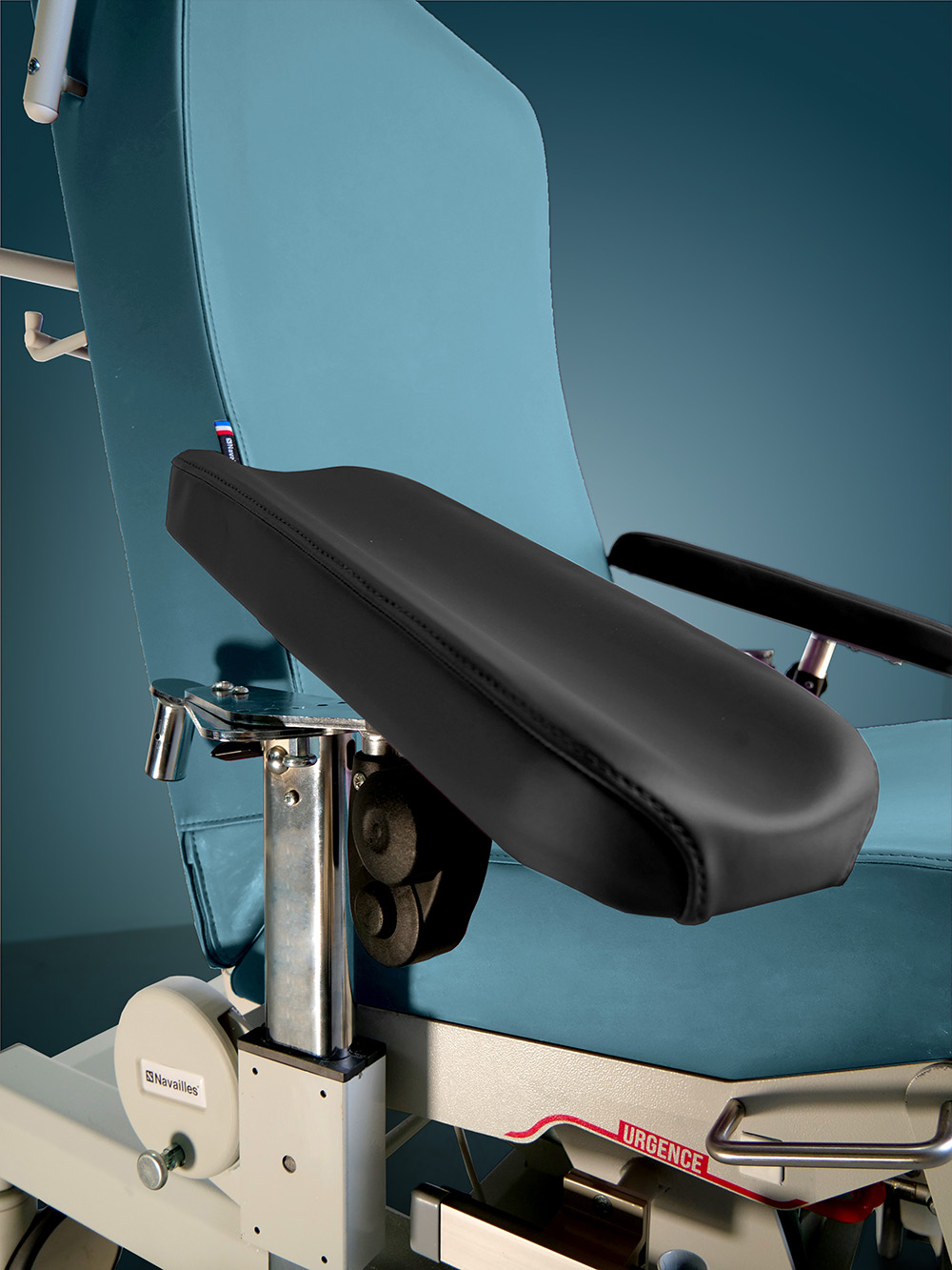 Hauteur d’assise ajustable électriquement pour s’adapter à chaque patient, sécuriser les transferts et faciliter le retour à la position debout.